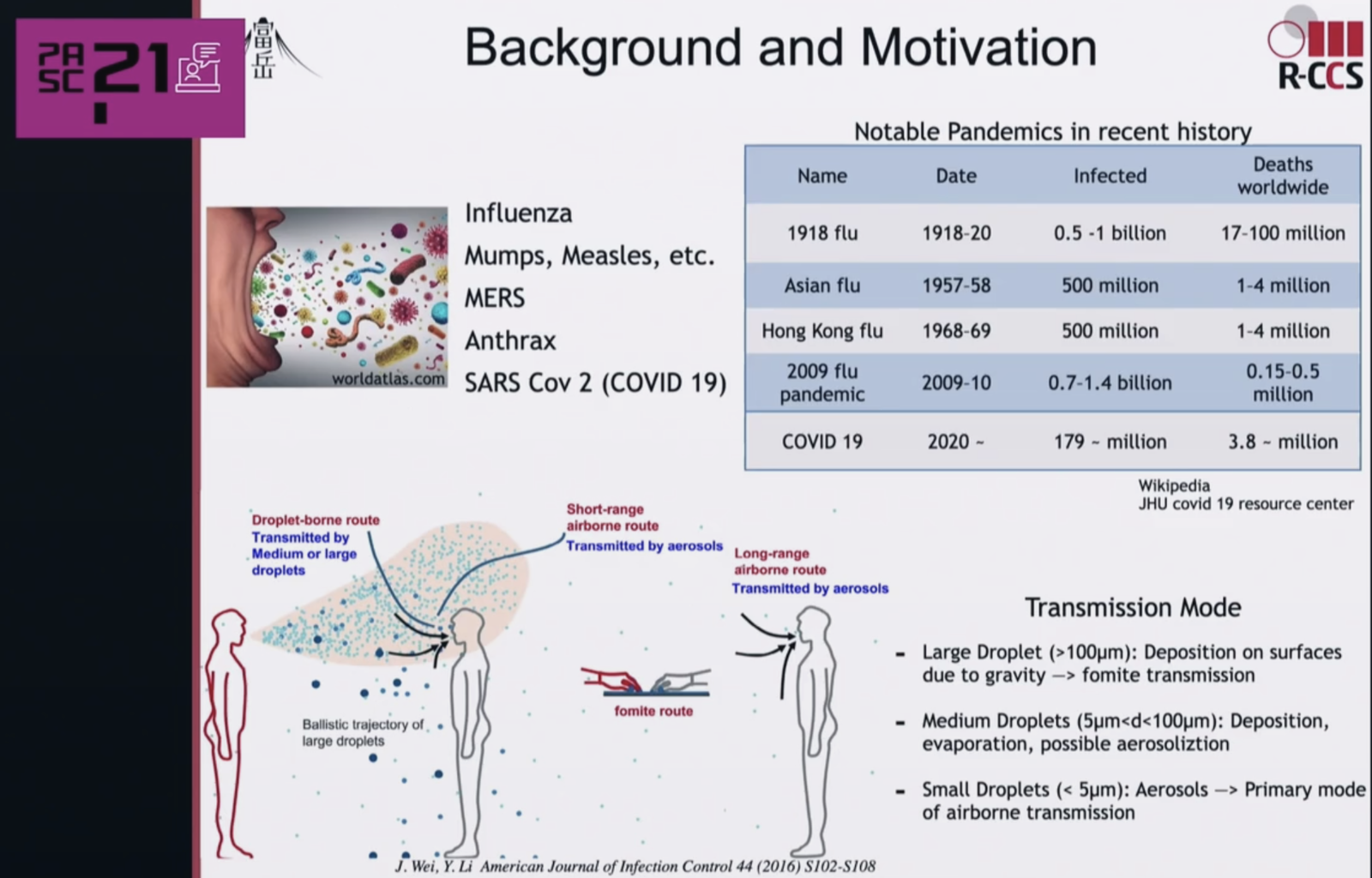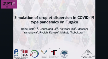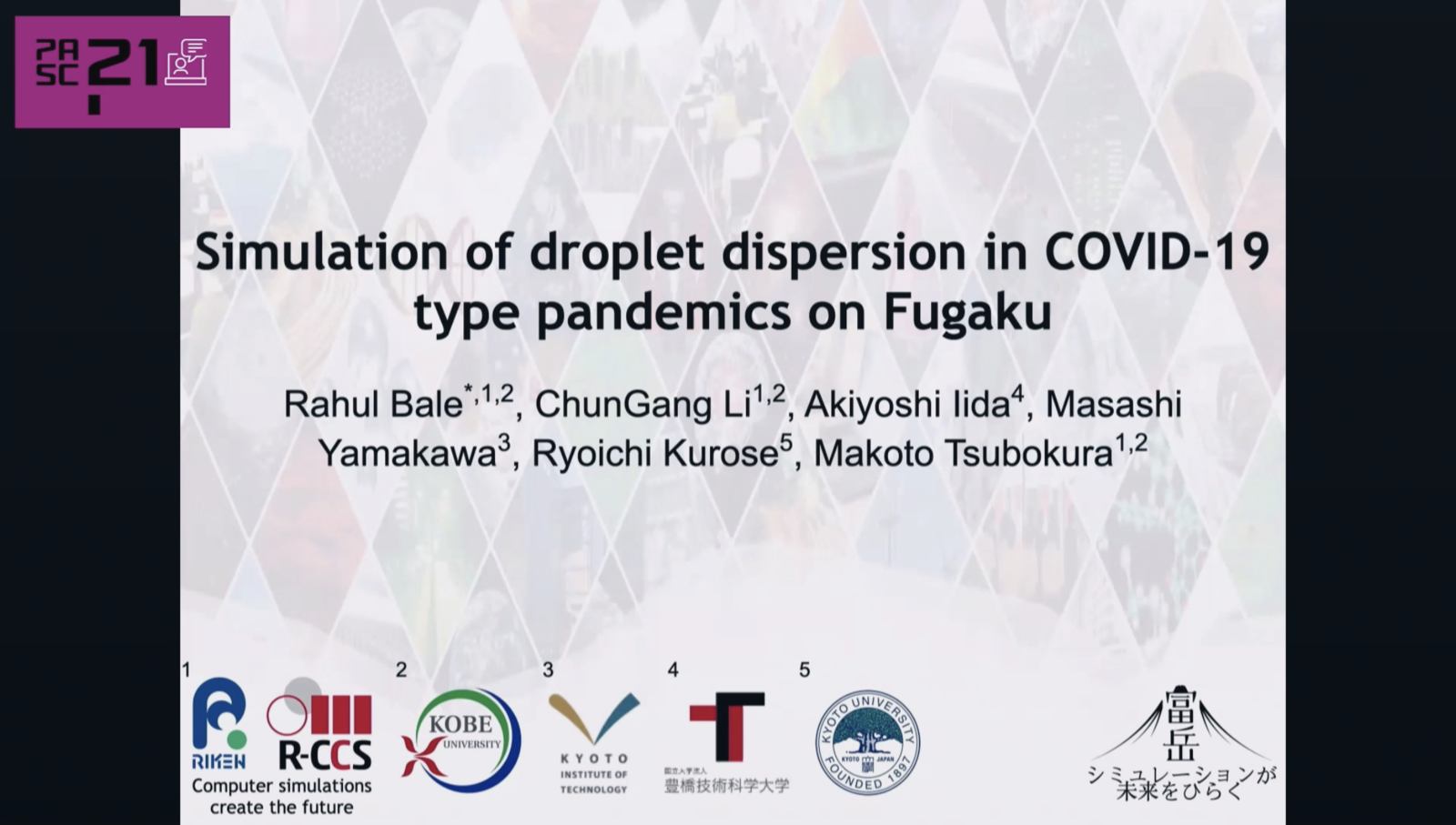 The best paper prize was awarded to Rahul Bale and colleagues from RIKEN, Kobe University, Kyoto Institute of Technology, Toyohashi University of Technology and Kyoto University for their paper "Simulation of Droplet Dispersion in COVID-19 Type Pandemics on Fugaku". Rahul presented the paper in a plenary session.