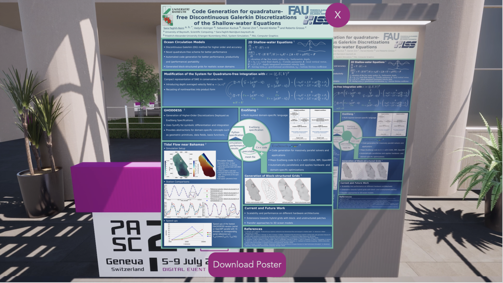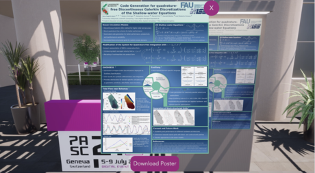 Posters play an important role in the conference as they offer the possibility to exchange ideas and expertise within and between scientific fields. Like in previous years, presenters had the opportunity to explain the main idea of their posters to the conference audience in a rapid-fire flash session. During the poster session, attendees had the chance to learn more about the posters and vote for their favourite contribution. The best poster prize was awarded to Sara Faghih-Naini from University of Bayreuth for her poster "Quadrature-Free Discontinuous Galerkin Method for Shallow-Water Equations." Below you will find out more about the PASC21 Best Poster, which has been awarded during the closing session.
